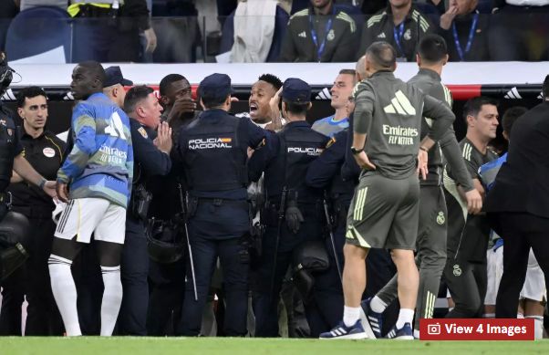 終場(chǎng)混戰(zhàn)爆發(fā)后,雙方替補(bǔ)席也在場(chǎng)邊陷入混亂,皇馬主帥哈維·阿隆索甚至進(jìn)入場(chǎng)內(nèi)拉走自己的球員。